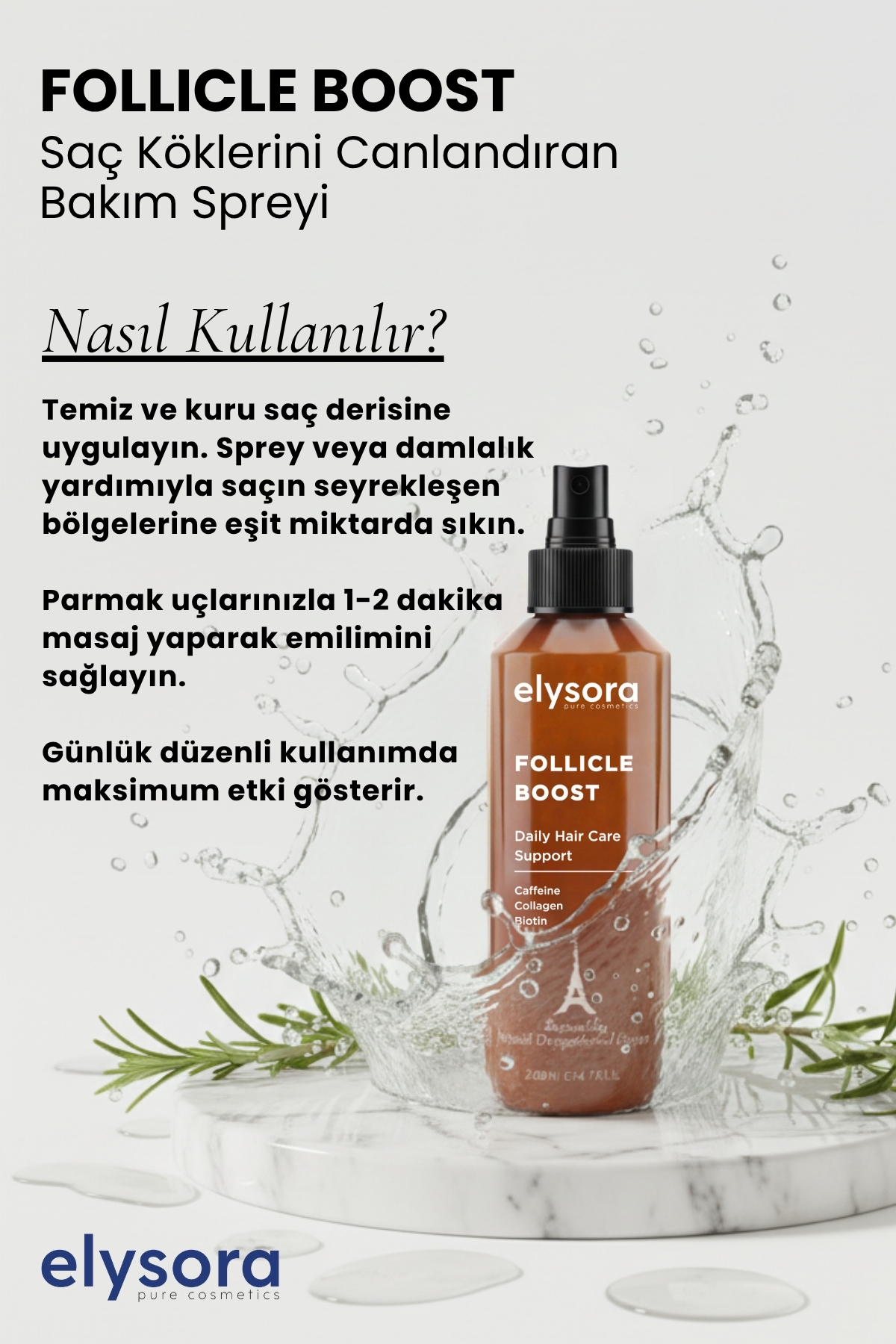 Kolay Uygulama:Temiz ve kuru saç derisine uygulayın. Sprey veya damlalık yardımıyla saçın seyrekleşen bölgelerine eşit miktarda sıkın. Parmak uçlarınızla 1-2 dakika masaj yaparak emilimini sağlayın. Günlük düzenli kullanımda maksimum etki gösterir.